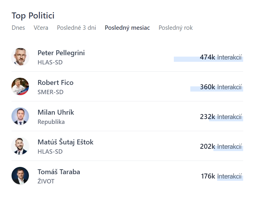 Top politikom na sociálnej sieti Facebook v počte interakcií za posledných 30 dní je zvolený prezident Peter Pellegrini, ktorý za svoje príspevky získal celkom 474-tisíc lajkov, komentárov a zdieľaní. Nasleduje ho premiér Robert Fico s 360-tisíc interakciami a prvú trojicu politikov uzatvára predseda mimoparlamentnej strany Republika Milan Uhrík s viac ako 232-tisíc interakciami. Do prvej päťky sa dostali aj ministri Matúš Šutaj Eštok z Hlasu-SD a Tomáš Taraba, ktorého nominovala strana SNS.