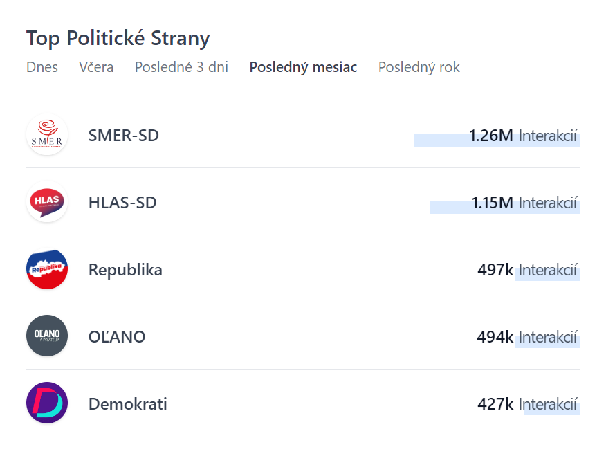 V rámci profilov politických strán zaznamenal najvyšší počet interakcií za posledných 30 dní Smer-SD (1,26 milióna) nasledovaný Hlasom-SD (1,15 milióna). O viac než polovicu menej interakcií dosiahla tretia Republika (497-tisíc). Prvú päťku uzatvárajú OĽANO a priatelia a Demokrati.