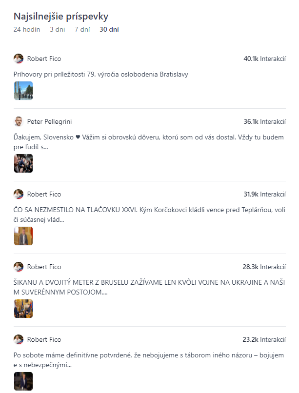 Rebríček jednotlivých príspevkov s najväčším počtom lajkov, komentárov a zdieľaní na Facebooku vedie suverénne premiér Robert Fico. Za posledných 30 dní má v prvej päťke až štyri príspevky. Najviac interakcií zaznamenali príhovory pri príležitosti 79. výročia oslobodenia Bratislavy, diskusia o dvojitom metri Bruselu či komentár k politike Progresívneho Slovenska.
