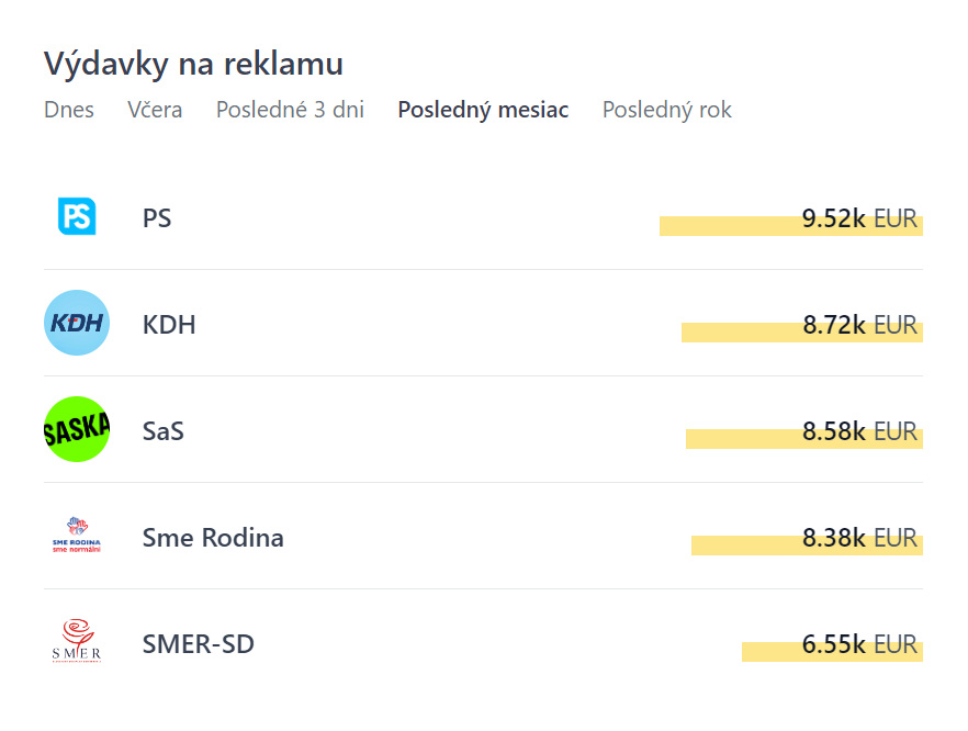 Vo výdavkoch na reklamu je už poradie odlišné a vedú strany parlamentnej opozície. PS investovalo za posledný mesiac do propagácie na Facebooku 9520 eur, KDH 8720 eur a SaS 8580 eur. Prekvapením je na štvrtom mieste mimoparlamentná strana Sme rodina. Do reklamy na Facebooku investovala 8380 eur. Prvú päticu uzatvára Smer-SD s výdavkom 6550 eur.